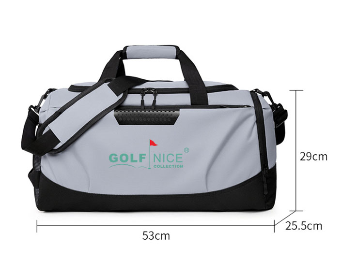首先,包體采用了簡約而現代的雙色拼接設計,灰黑配色低調卻極富質感,適合各種場合,無論是運動后的小憩還是商務場合的短途旅行,都能彰顯使用者的品位與風范。正面的“GOLF NICE COLLECTION”標志,搭配簡約的紅色旗幟圖案,進一步體現了這款包與高爾夫運動的深度關聯。